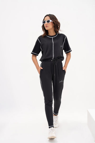 Designed for comfort and versatility, this unisex black tracksuit features a round-neck top with ribbed cuffs, matching joggers, and signature Eight Lines embroidery. Made from 100% cotton jersey, it offers breathability, softness, and stretch—ideal for both indoor lounging and casual outings. A modern essential, built for all seasons.